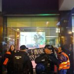 A meio da Avenida Almirante Reis, em frente ao Restaurante Portugália, duas ativistas da Climáximo quebraram o vidro de uma sucursal do Banco Santander.